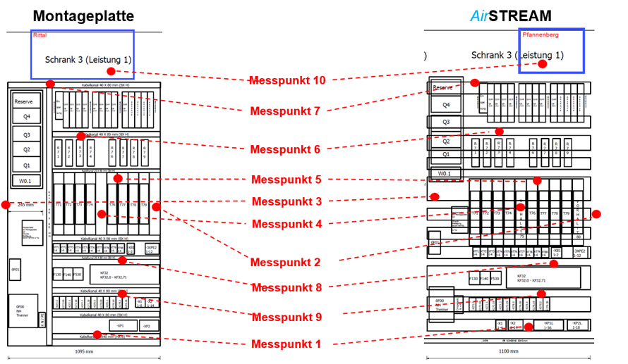 Anlage I wird über ein Klimagerät mit 1.500 Watt Verlustleistung klimatisiert, Anlage II über Wärmetauscher mit 1.450 Watt. Die Verlustleistung der beiden Kühlmedien spielt bei dieser Untersuchung jedoch eine Nebenrolle, da die kalte Luft bei beiden Varianten vom Dach kommt. Der Fokus der Studie war vielmehr auf Nachweis und Wirkung gezielter Luftführung im Schaltschrank ausgerichtet, da die Luft bei AirSTREAM, im Gegensatz zur Montagetafel, frei zirkulieren kann. Beide Messungen in den Schaltschrankaufbauten waren bei gleicher Taktung jeweils für rund 6 Stunden in eine Fertigungslinie zur vollautomatischen Einpressung von Ventisitzringen und Ventilführungen in den Zylinderkopf eines V6 Otto-Motors eingebunden.