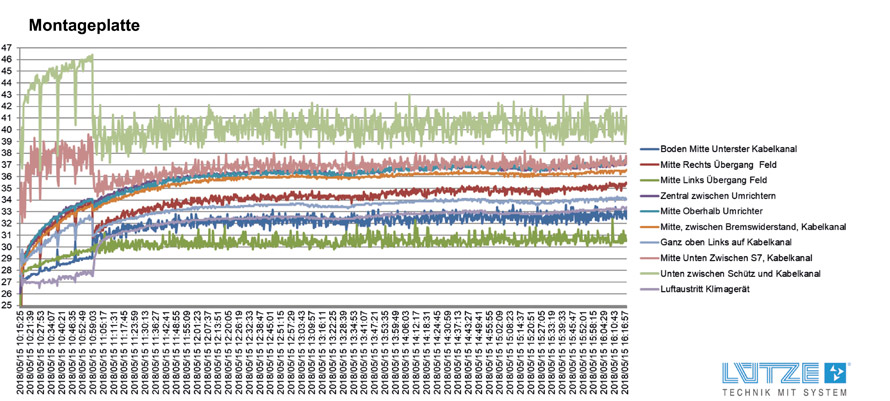 Nach Betriebsbeginn wurden mit Hilfe von 10 Messfühlern die Umgebungs- und Innentemperaturen erfasst. Die tatsächliche Leistungsaufnahme der beiden Anlagen wurde nicht betrachtet, da von einer identischen Taktung ausgegangen wurde. Dabei wurde berücksichtigt, dass die Temperatur besonders an den wärmekritischen Punkten im Schrank - also z.B. an den Komponenten mit hoher Wärmeverlustleistung (FU) – gemessen wird. Am Versuchstag eins wurde bei der Temperaturdaten-Erfassung beim Aufbau mit Montageplatte eine Umgebungstemperatur von 22°C gemessen, am Tag zwei beim Einsatz des LÜTZE AirSTREAM-Verdrahtungsrahmens waren es 23,9°C.